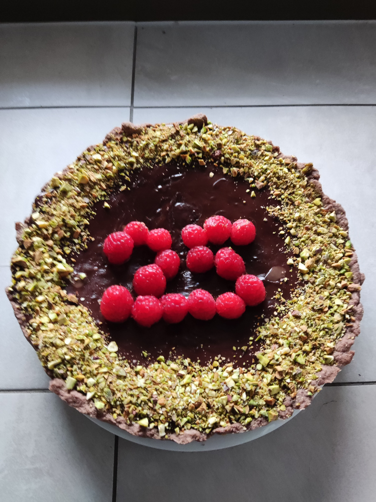 Himbeeren halbieren und auf der Pistazienpaste verteilen.
